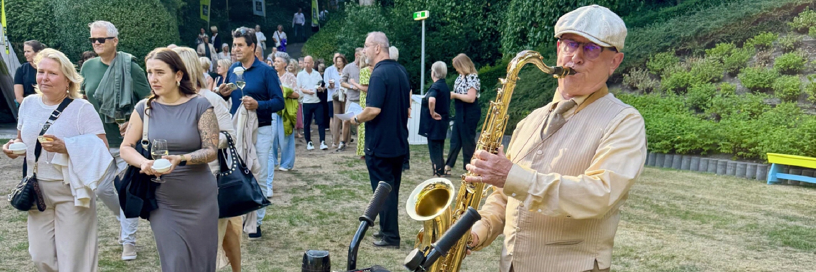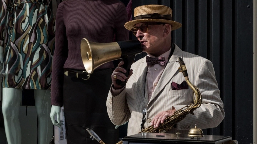 In de sfeer, kleding outfit en tijdsbeeld van de Roaring 20-ties (Roaring Twenties). Mobiele live muziek voor elke gelegenheid! Saxofoon, klarinet en zang daarbij een begeleiding van een volledige ritmesectie op mp3-speler,een volledig dixielandorkest